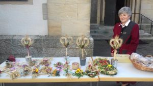 Die Wandkränze, Getreideherzen, Schleifen und Gestecke wurden am Erntedankwochenende vor und nach den Gottesdiensten verkauft.